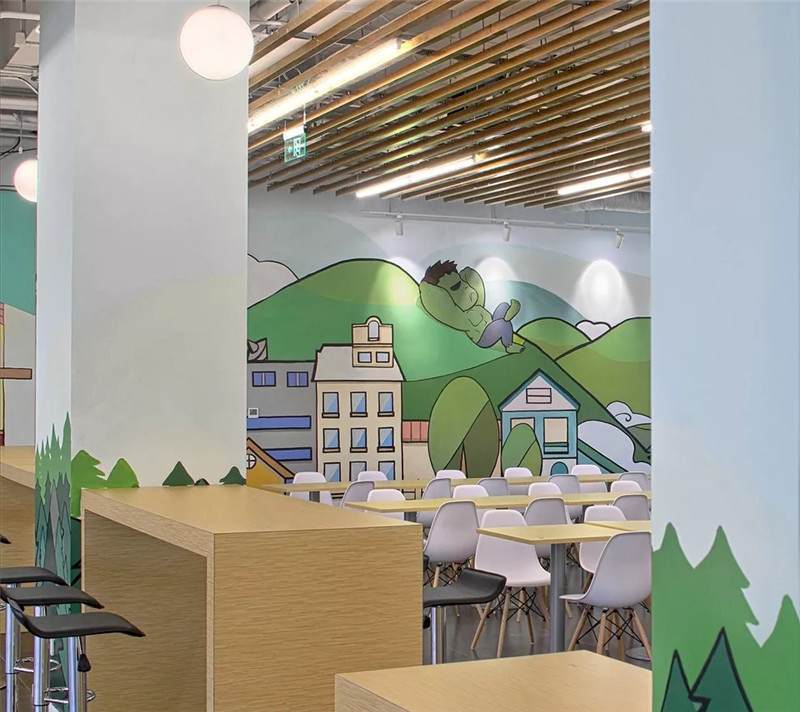 這幅畫是最初設(shè)計(jì)的圖案,圖形繪制的大粉筆畫,它的好處是可以定期的更換,就像黑板報(bào)一樣來制定不同的主題,就員工的活動(dòng),員工的留言簽字都可以在這體現(xiàn),如同活的展示墻。
