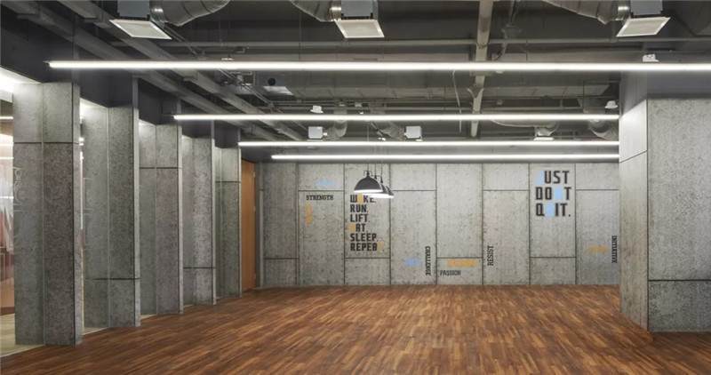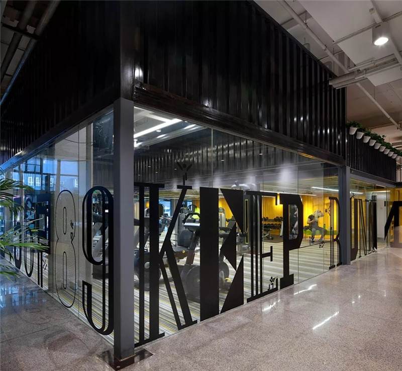 整體空間設(shè)計(jì)多層次,所以它的貼膜采用黑色字母來呈現(xiàn)健身區(qū)的氛圍。