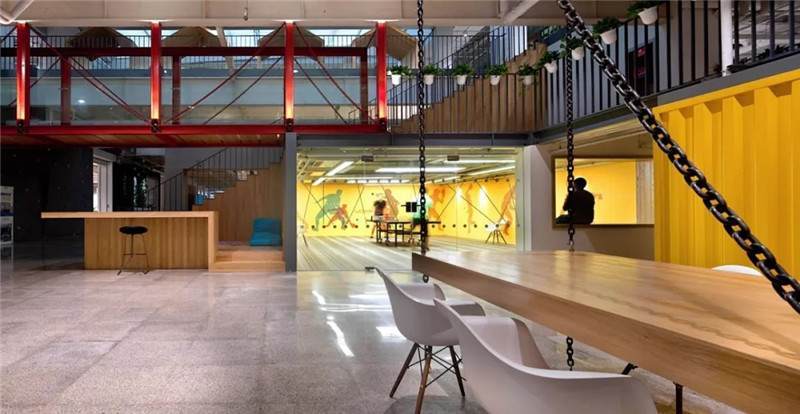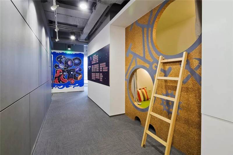 比如這張圖,也是華米科技北京的辦公室,用奧松板開兩個(gè)洞,精巧可愛的睡眠艙趴在墻上,利用兩個(gè)洞把它組成了自行車的輪廓,超萌的壁畫使墻面不再單一,色彩的對(duì)比更加直觀,同時(shí)用太空艙的形式增添趣味點(diǎn),不論是做設(shè)計(jì)師還是做工匠,都要秉持設(shè)計(jì)的理念去進(jìn)行選材和制造工藝,把握好每一個(gè)細(xì)節(jié)。