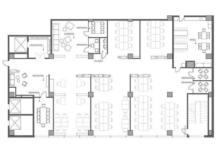 縱向型的空間構(gòu)成,每一個(gè)工作空間猶如一粒粒珠子被串聯(lián)在中軸線上,這些開放工作區(qū)沿窗而設(shè),最大化引入自然光線,同時(shí)各區(qū)域又可以任意變化。在功能規(guī)劃上設(shè)計(jì)了迎賓區(qū)、休息區(qū)、各種大小的會(huì)議室和自助餐廳。